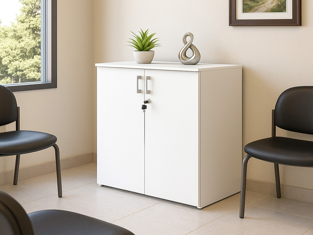 Gabinete bajo con dos puertas, perfecto para almacenar y organizar materiales en un espacio compacto y accesible.