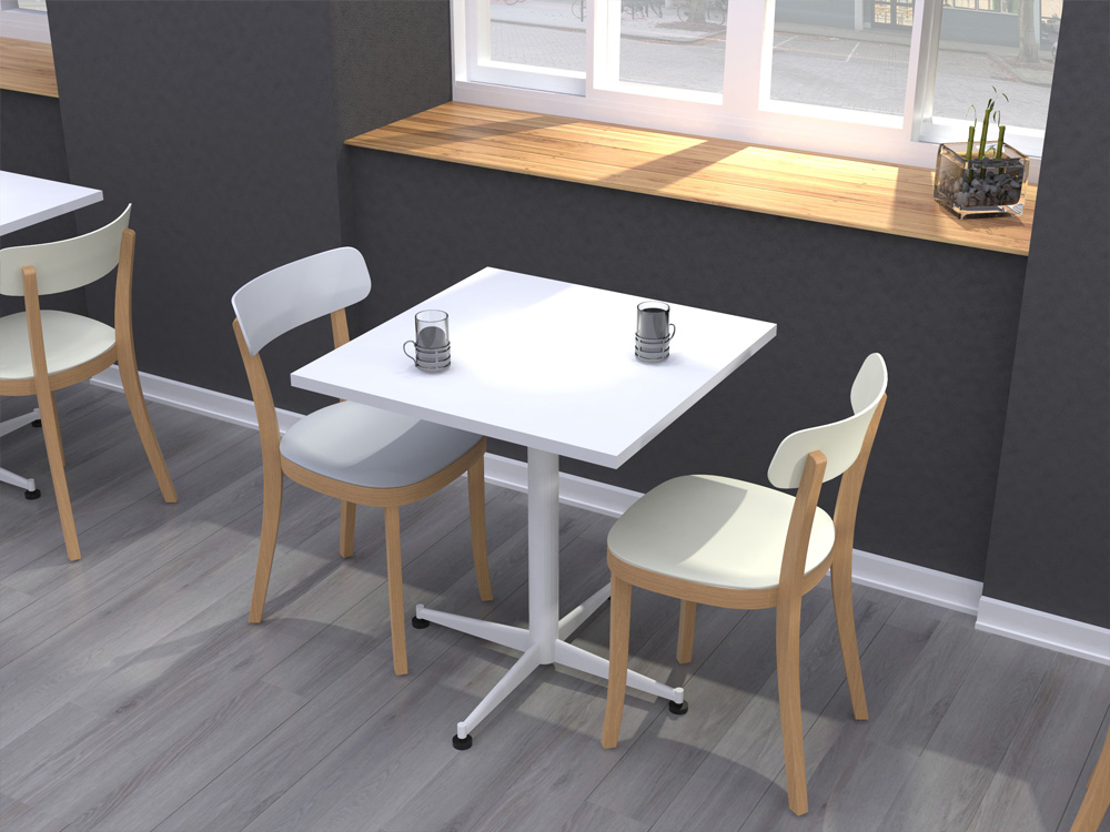 Mesa robusta con cubierta cuadrada de formalita, diseñada para resistir el uso intensivo en restaurantes y cafeterías.