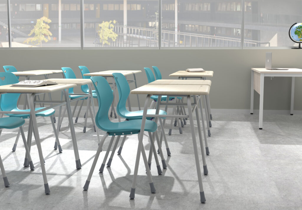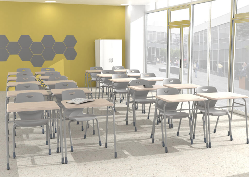 Estructura fabricada de tubos de acero termo esmaltados. Cubierta de sustrato de resina moldeada a alta presión. Terminación de las patas con glide pivotal, asegurando el perfecto ajuste al piso, entregando estabilidad en su uso.